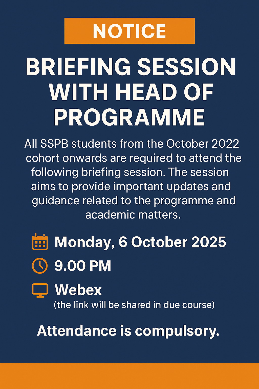📢 NOTICE: BRIEFING SESSION WITH HEAD OF PROGRAM Posted by staf ppi | Oct 4, 2025 | Degree, NEWS Webex Link: https://utm.webex.com/utm/j.php?MTID=m5205684a7f32e3caa6359e256bc232a6