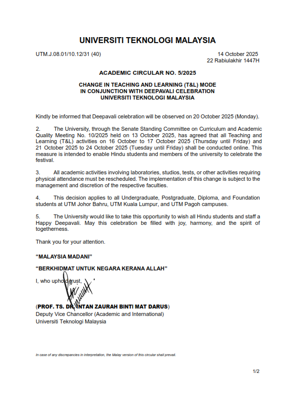 LATEST : CHANGE IN TEACHING & LEARNING (T &L) MODE IN CONJUNCTION WITH DEEPAVALI CELEBRATION SPACE UTM Posted by staf ppi | Oct 15, 2025 | Activities, Bridging Programme, News LATEST_1_STRATAA_2025_BIL_5_2025_BM_&_ENGLISH_PEKELILING_AKADEMIK (2)Download