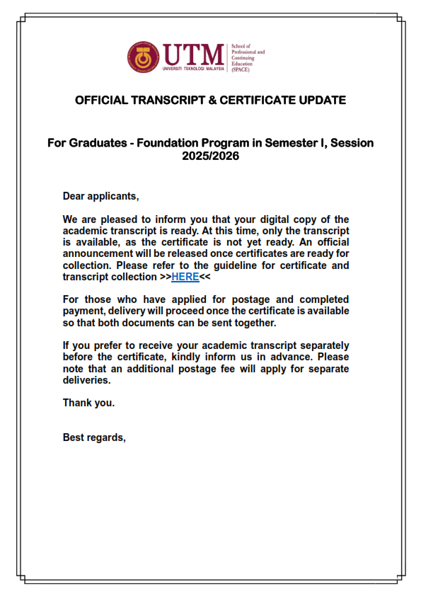 OFFICIAL TRANSCRIPT & CERTIFICATE UPDATE Posted by staf ppi | Feb 27, 2026 | Foundation, Foundation News For Graduates – Foundation Program in Semester I, Session 2025/2026 ANNOUNCEMENT OFFICIAL TRANSCRIPT_CERTIFICATE UPDATEDownload